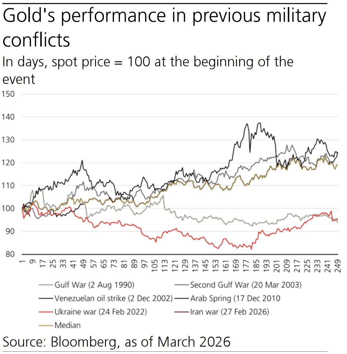 UBS explains why this is historically less surprising than it may seem: Gold’s track record as a safe haven during military conflicts is mixed - something the current price action reflects. For those seeking a direct hedge against the Middle East conflict, oil remains the better instrument. Gold offers less protection against the conflict itself, but rather against its monetary and financial side effects - think inflationary pressure, currency devaluation, or fiscal dislocations.